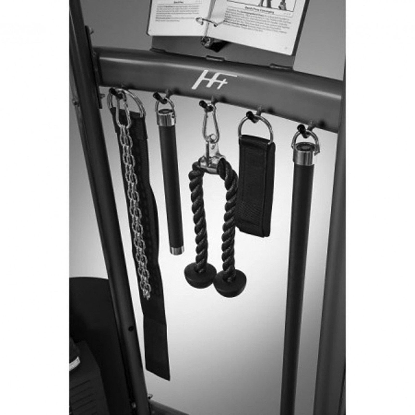The pulleys, pull-up bar and attachments cover a broad mix of upper and lower body work such as rows, flyes, chops, presses, squats, hip movements and arm exercises.
