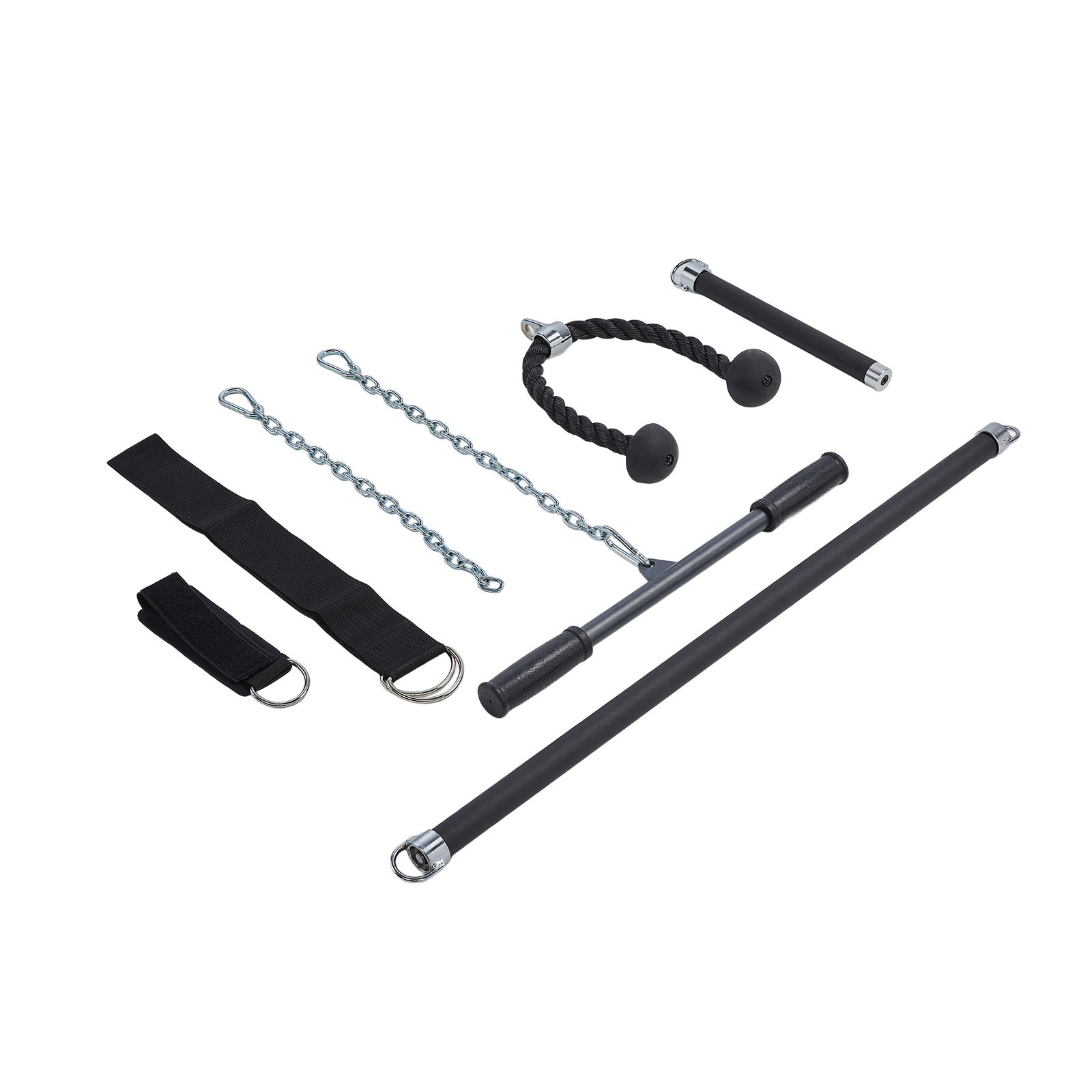 The BodyCraft MFT includes a selection of attachments which can all be mounted on the multi-functional trainer backboard. Attachments include: ankle strap, barbell, pulldown bar, tricep rope, pulley handles and a baton handle.