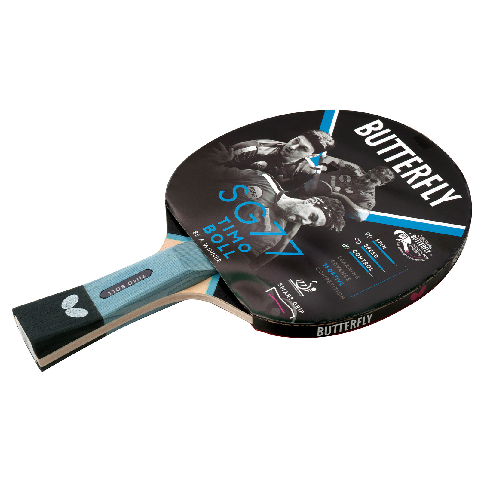 The Butterfly Timo Boll SG77 Table Tennis Bat offers a fast, spin-heavy feel while still keeping enough control in the mix. It works well for players who like a quicker, more attacking style. The Pan Asia rubber, the firmer sponge and the concave handle come together to give the bat a crisp, lively response on each shot.