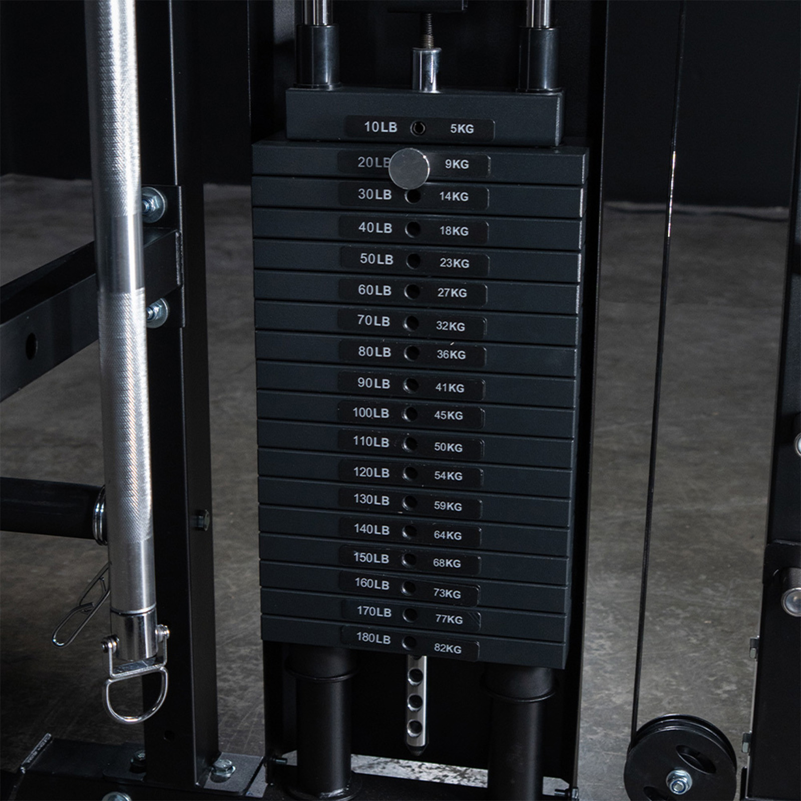 - 16 kg (35 lb) Smith bar with dual 30 cm (12-inch) Olympic sleeves
