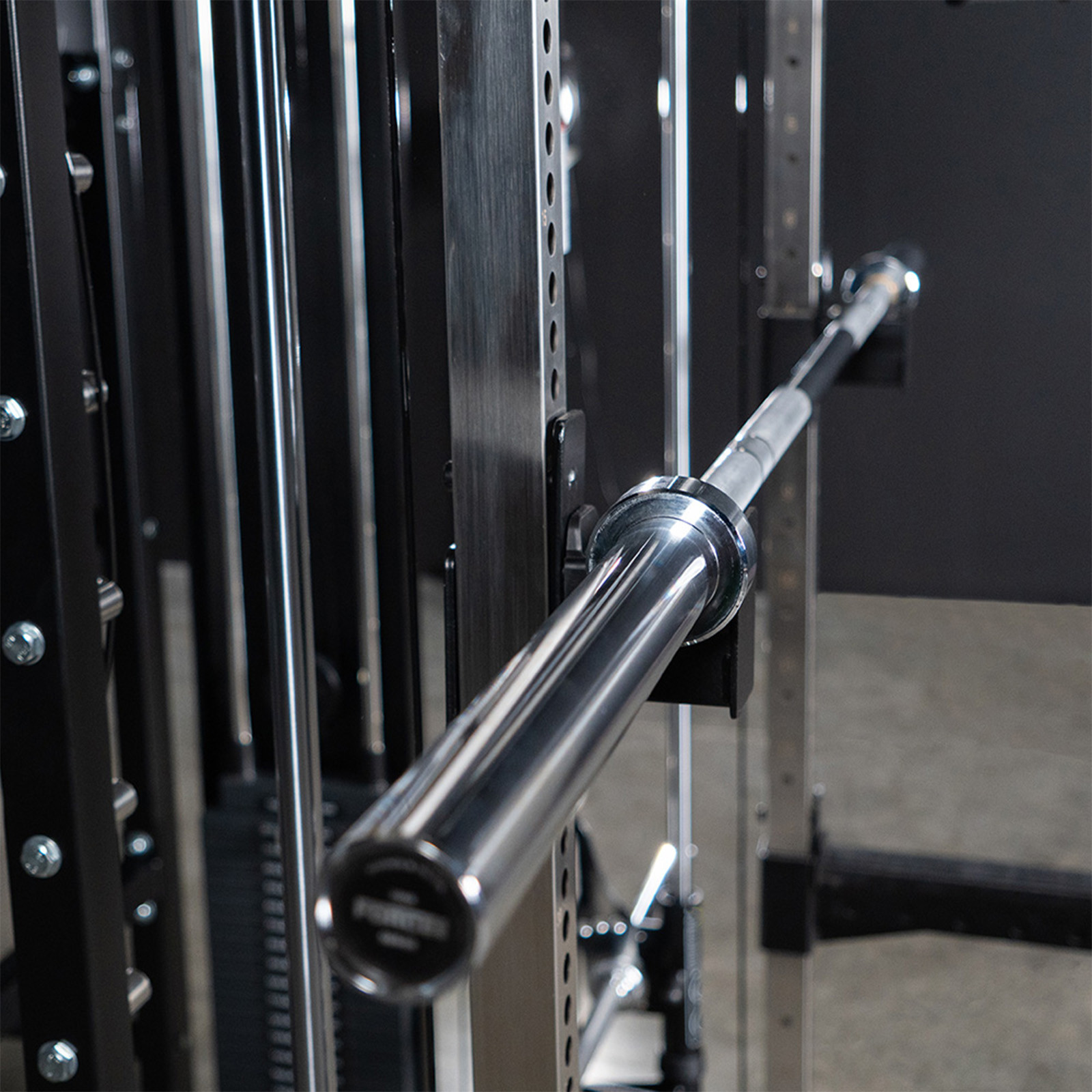 You train on a full setup in one frame. A power rack, a Smith machine, and a dual cable functional trainer sit together. The chin-up bar and landmine station are part of the frame, and the attachments are included.