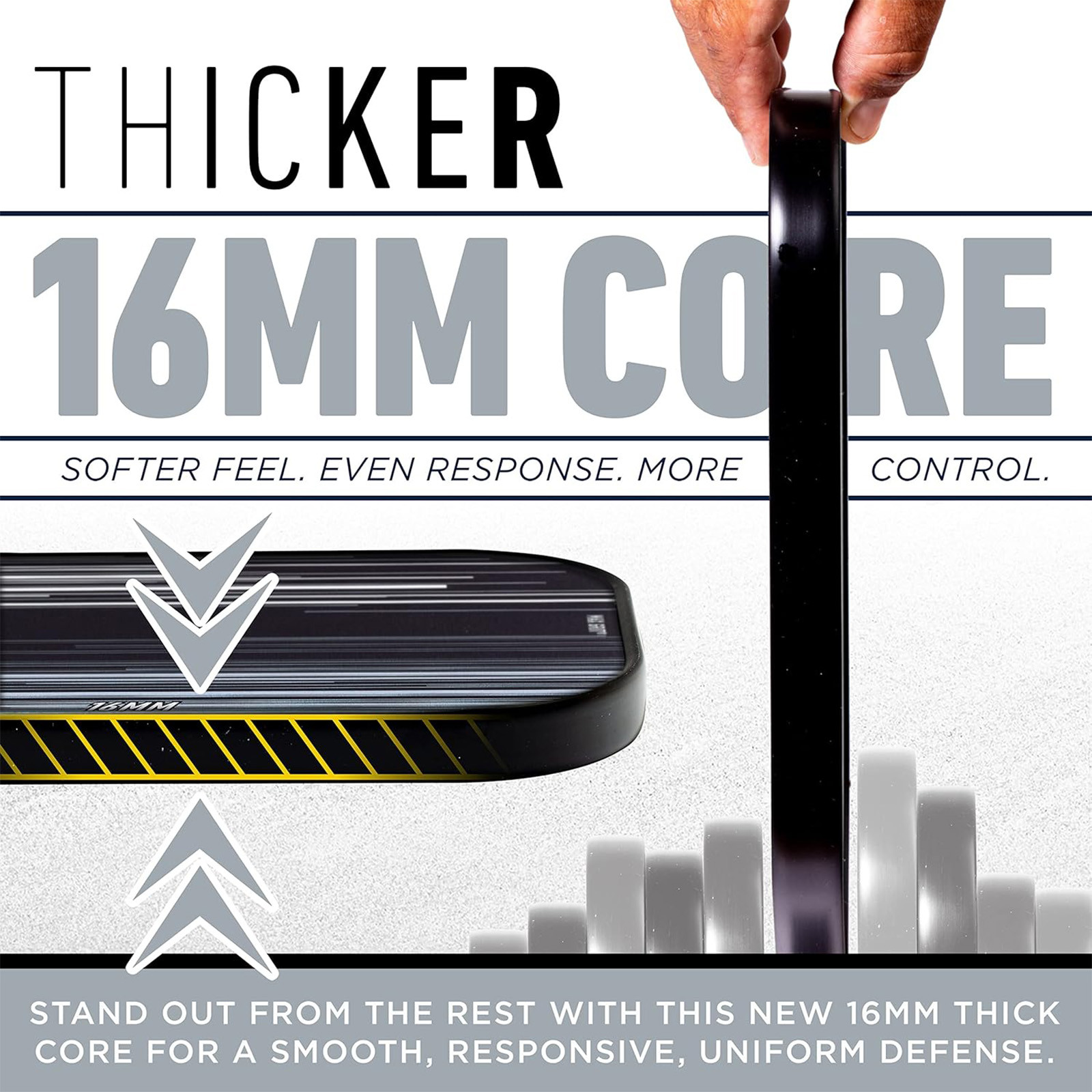 The Franklin Signature Pro Series Pickleball Paddle (16 mm) has a solid, controlled feel on court. The thicker core softens the impact and gives a more even response on contact.
