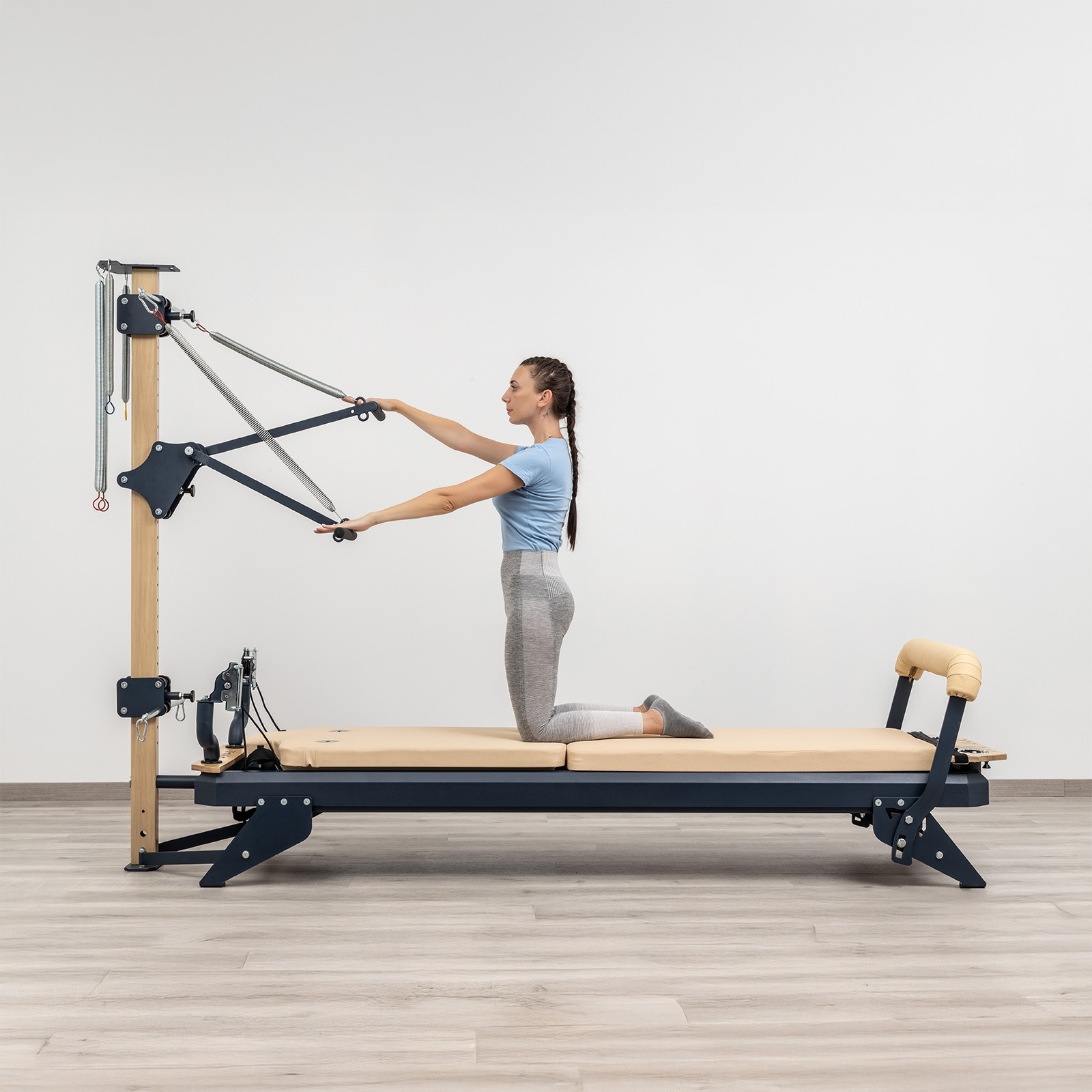 The tower opens up extra options like supine leg springs, seated arm work, and upright push-throughs, all using the same setup.