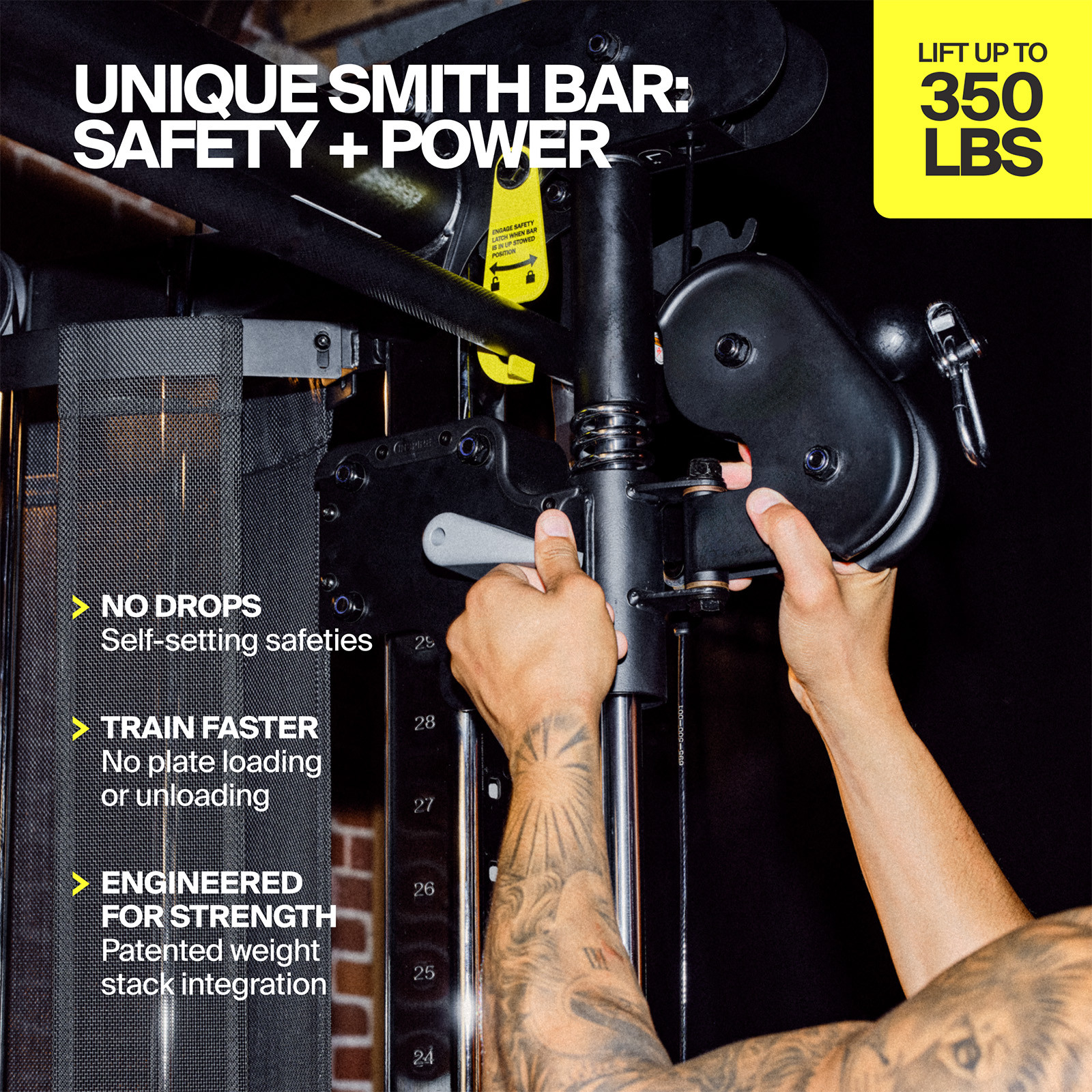 Centr's patented Smith bar design lets you adjust resistance with a single, quick pin release, so you can move through your workout effectively. No more changing plates between sets.