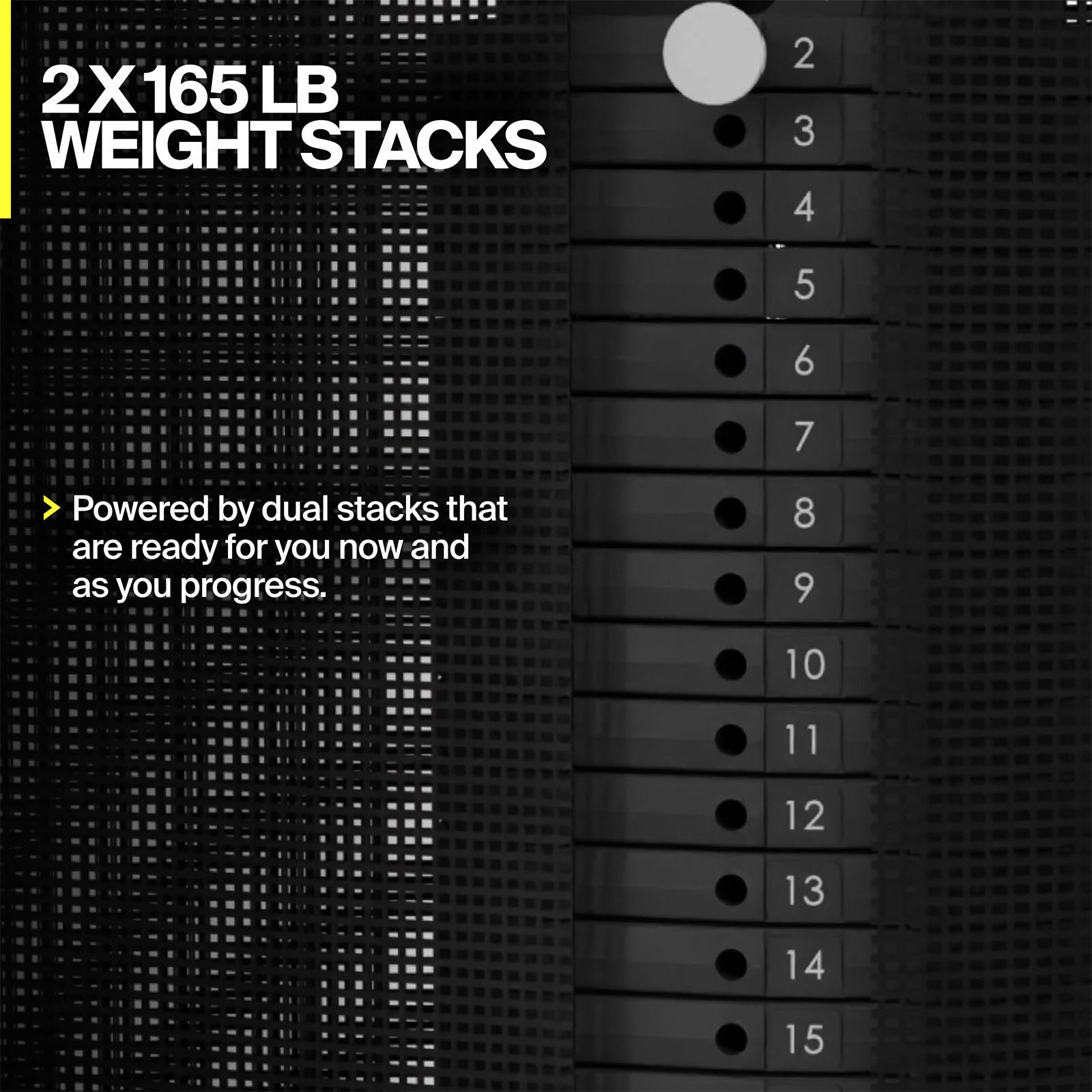 - Twin weight stacks: each weighing 165 lbs (74.8 kg)