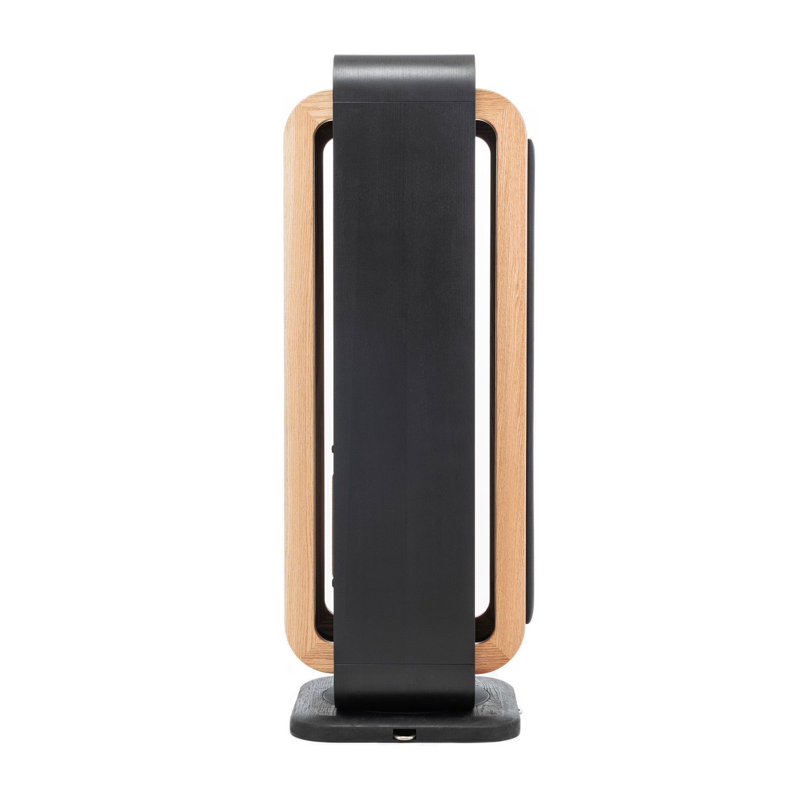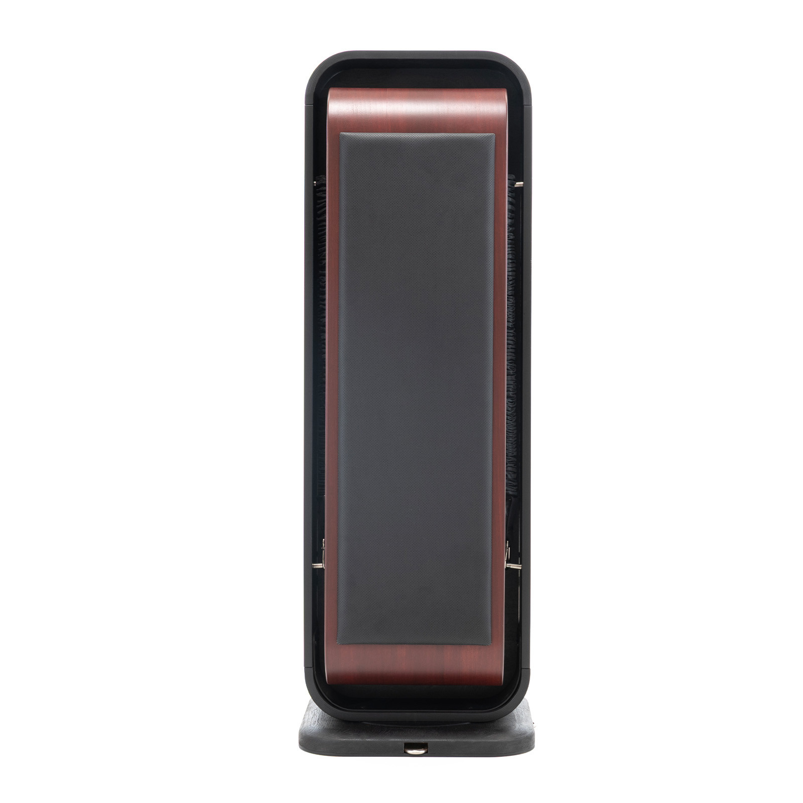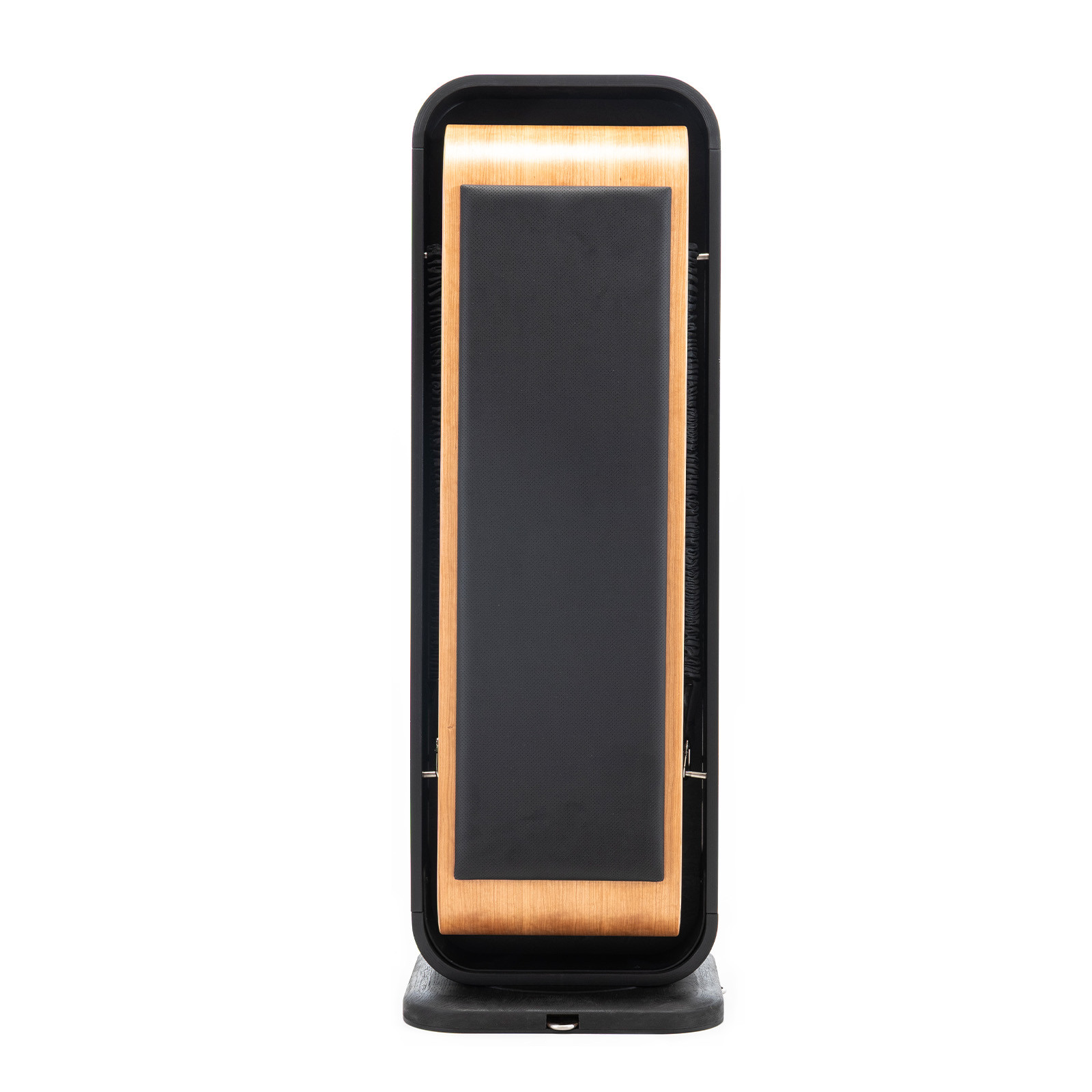 Everything lives inside the tower. Dumbbells, resistance tubes, steps, bench, mat, and cork accessories all have their place. The panels detach and the tower swivels during training. When you are done, everything tucks back away and the room feels calm again.