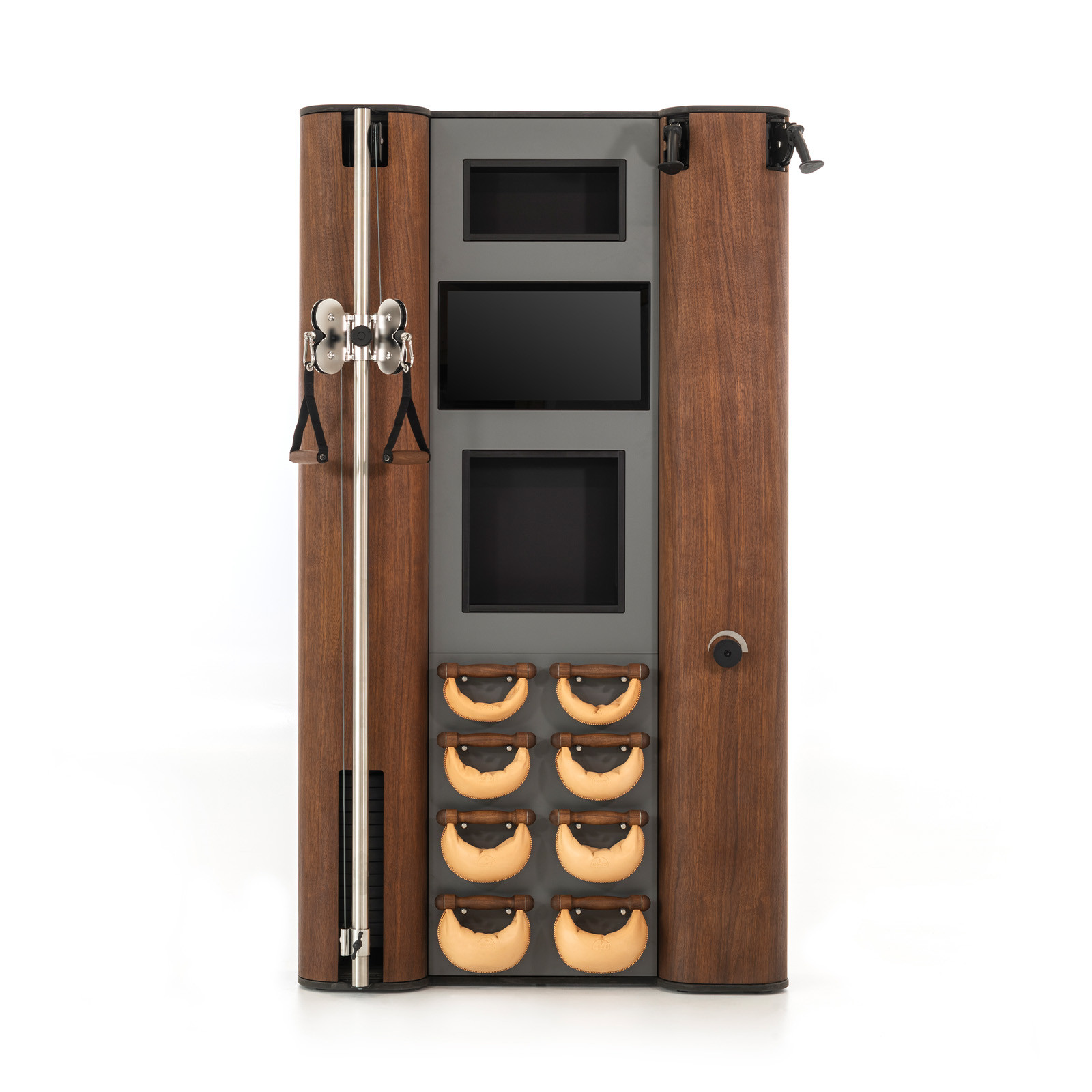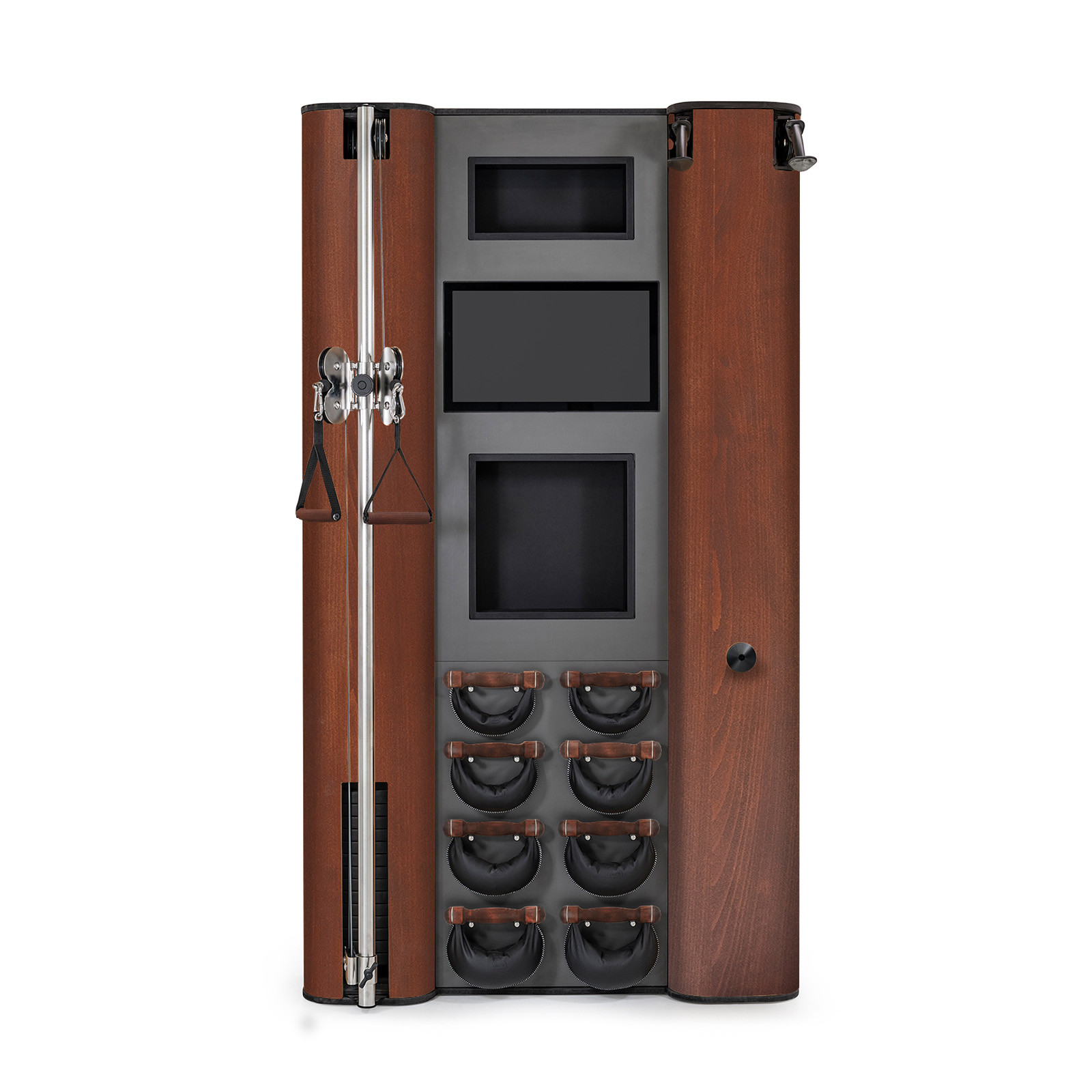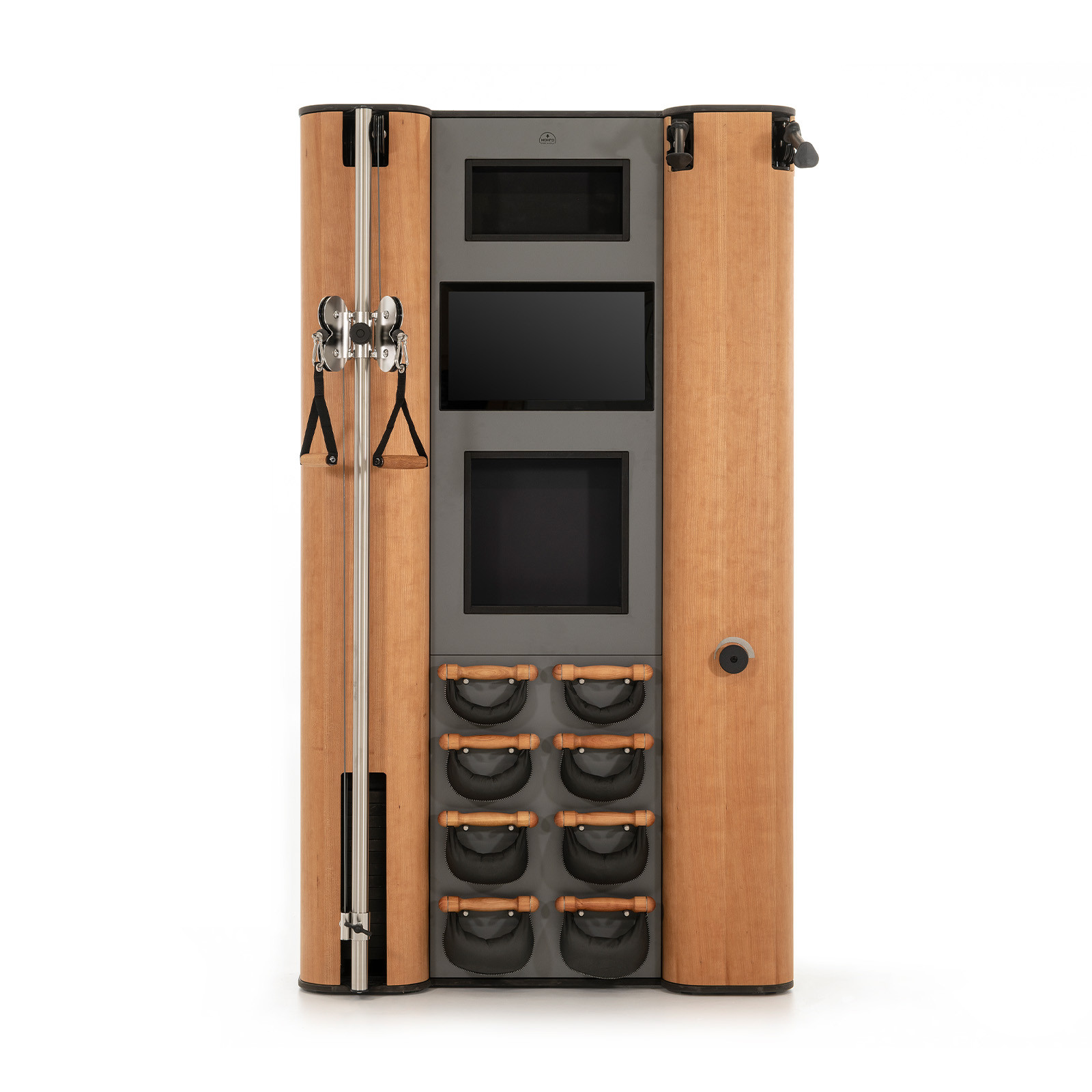 The NOHRD Wall Compact offers a complete functional fitness station within a minimal footprint. This premium unit includes a high/low adjustable cable machine, an innovative cross-country ski trainer, four pairs of hand-stitched leather SwingBells, and an integrated touchscreen training system, all housed in a stylish wooden frame. Combining high-quality design and advanced engineering, the NOHRD Wall Compact enables full-body workouts, including bodyweight and resistance training, HIIT sessions, and strength/endurance training.