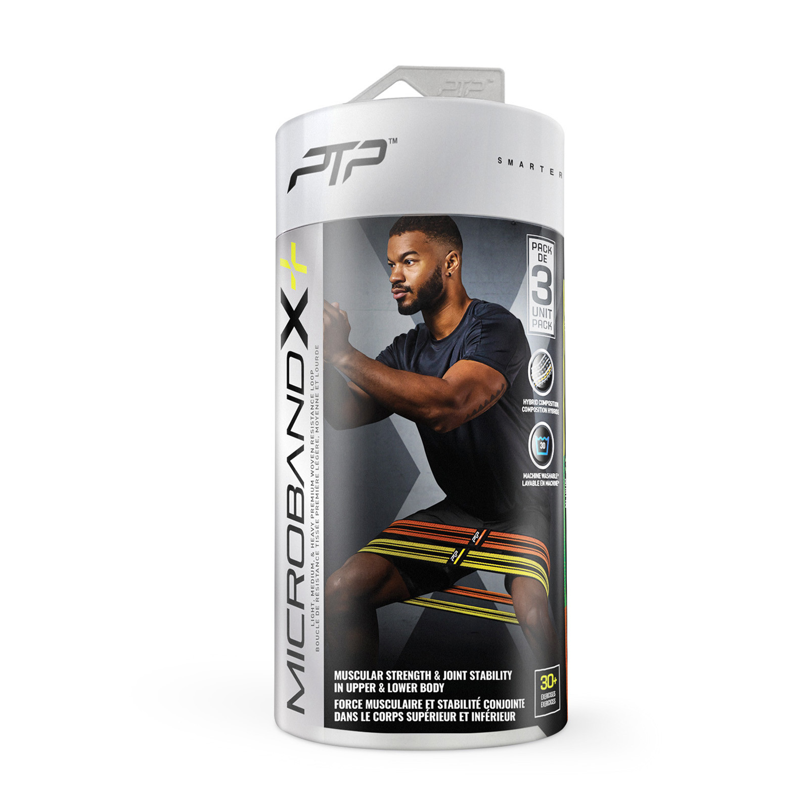 The PTP MicroBand X Combo+ 3 Pack comes with light, medium and heavy bands for training your upper and lower body. The soft Reactive-Knit fabric stays flat and comfortable, never rolling or sticking while you move. Switch between bands or use them together when you want an extra challenge. The PTP App also gives you guided exercises for the bands.