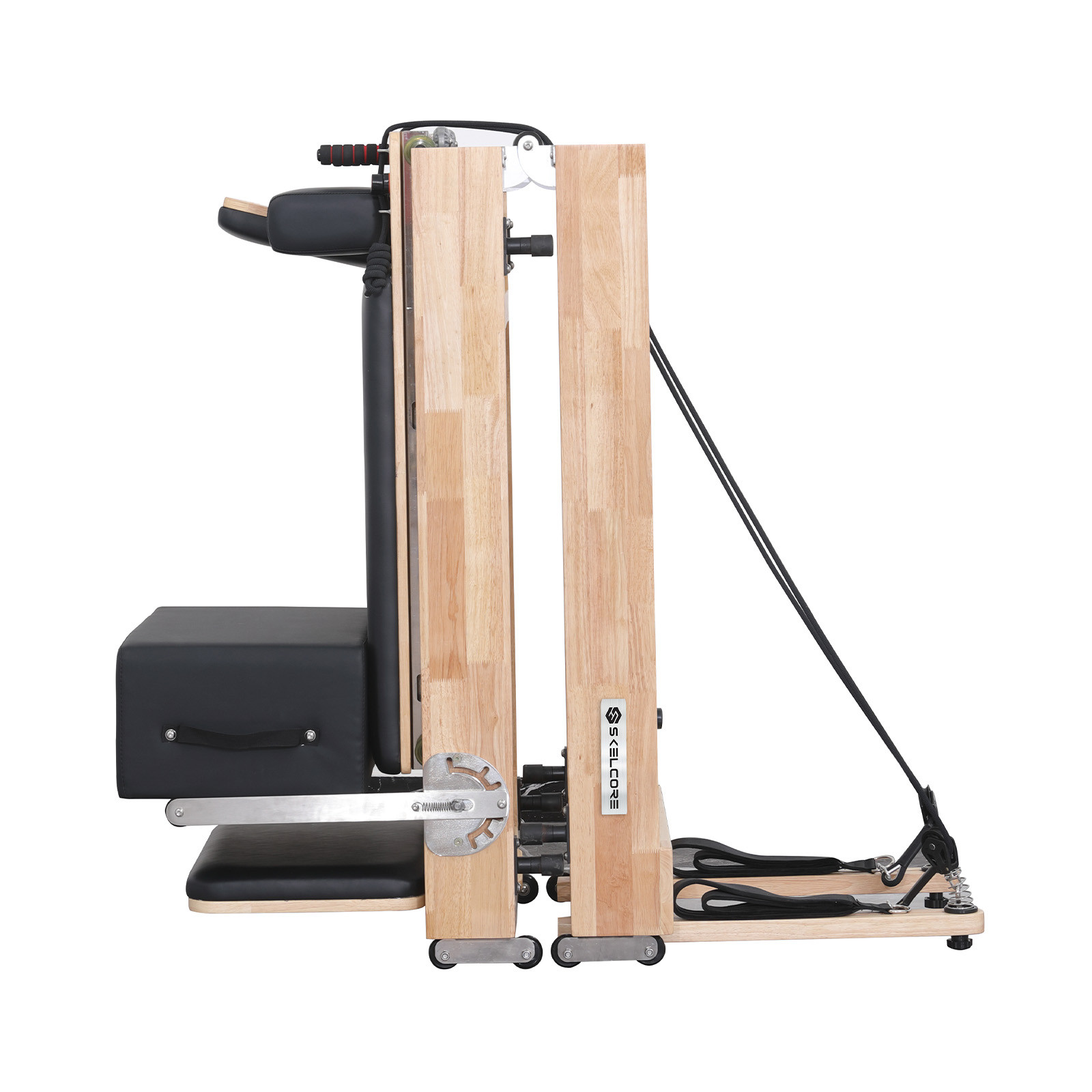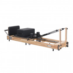 The Skelcore Foldable Reformer - Oak sits on a solid oak frame that holds steady while you move. The carriage runs on eight wheels that keep the motion smooth, quiet and balanced along the track.