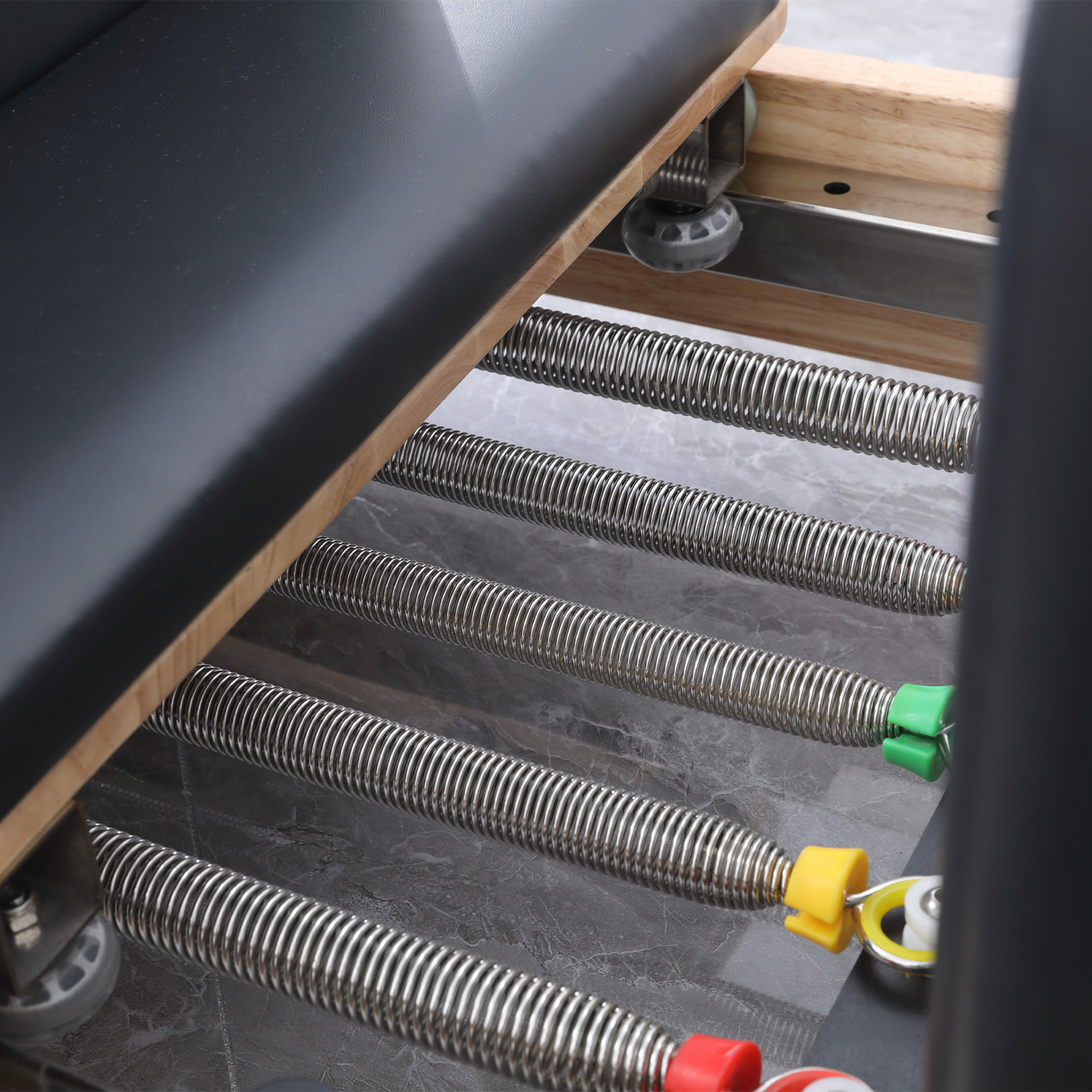 The reformer includes five piano wire springs, each offering a different level of resistance. You also get two rows of hooks so you can shift the resistance as you progress.