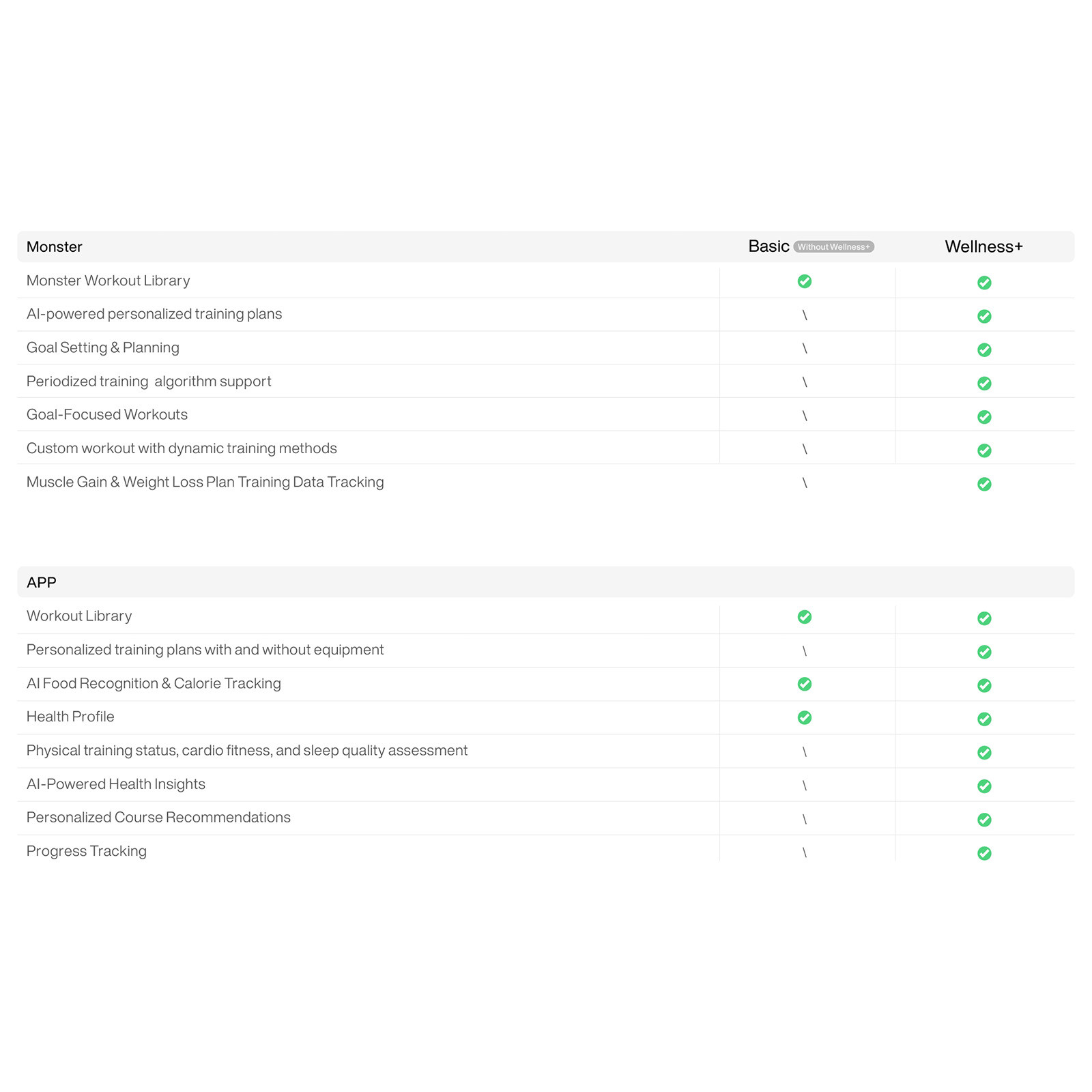 - Performance tracking with guided workouts, progress insights and optional AI-led planning