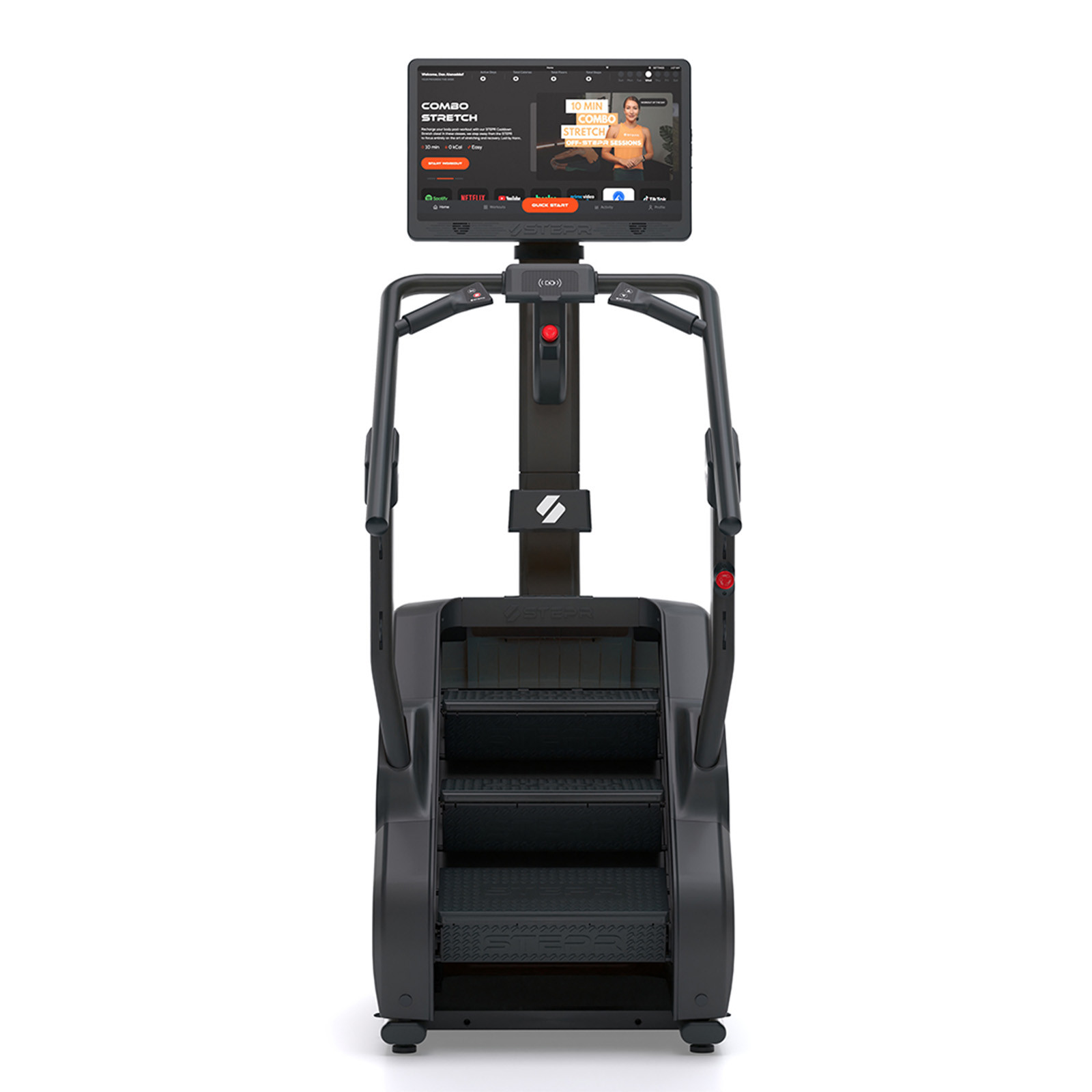 The STEPR PRO+ features a 27" HD Touchscreen, featuring on-demand classes, guided scenic training sessions, and streaming entertainment apps such as YouTube, Netflix, Spotify, and Prime Video. No membership or subscription is required, and the screen swivels 360°.
