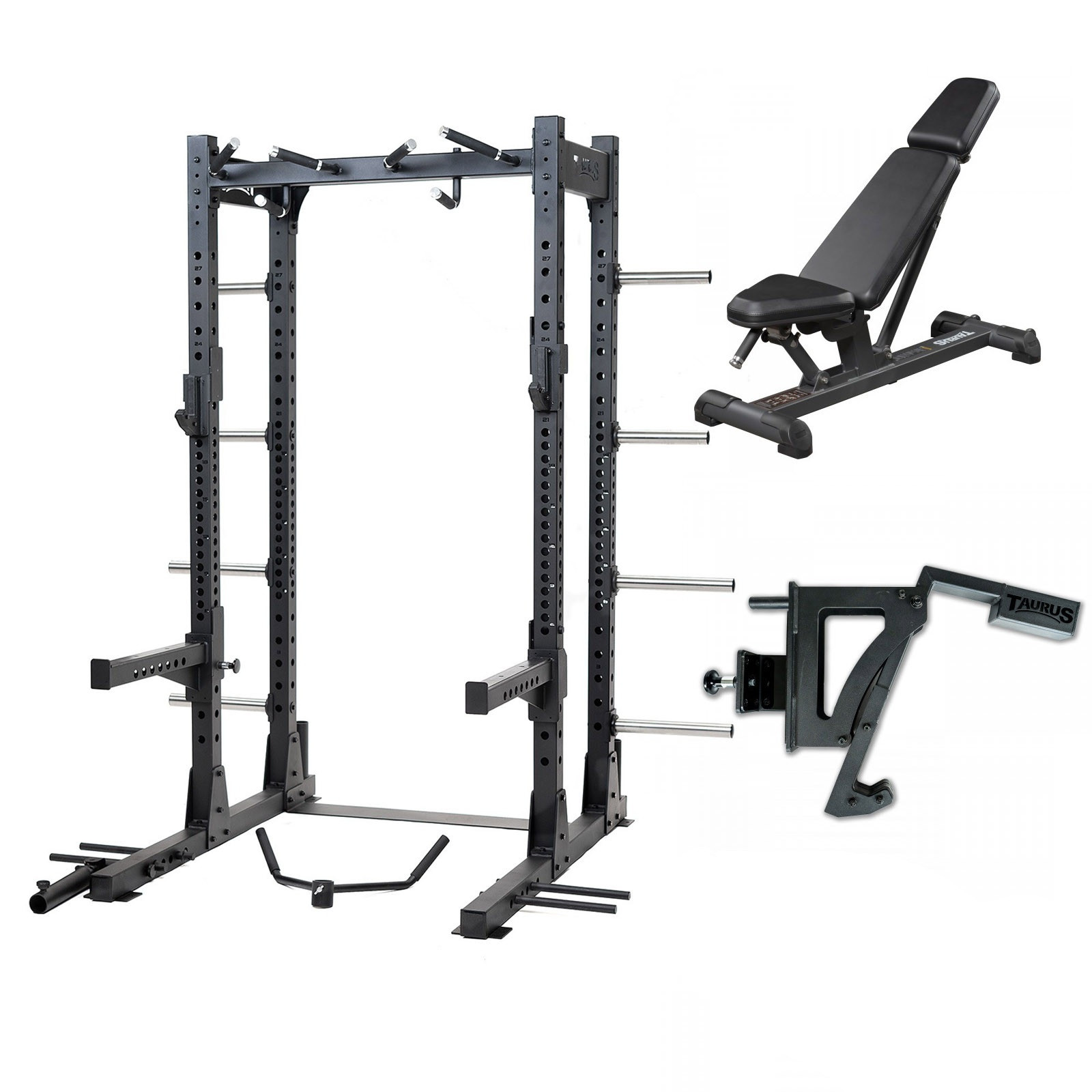 The Taurus Elite Half Rack V2 is built with a heavy-duty steel frame that is coated black for a sleek and modern look for your gym. The frame has the option to be anchored to the floor for an extra level of security when lifting heavy. The Taurus Elite Adjustable Weight Bench is a great companion to the V2 and is sold separately.