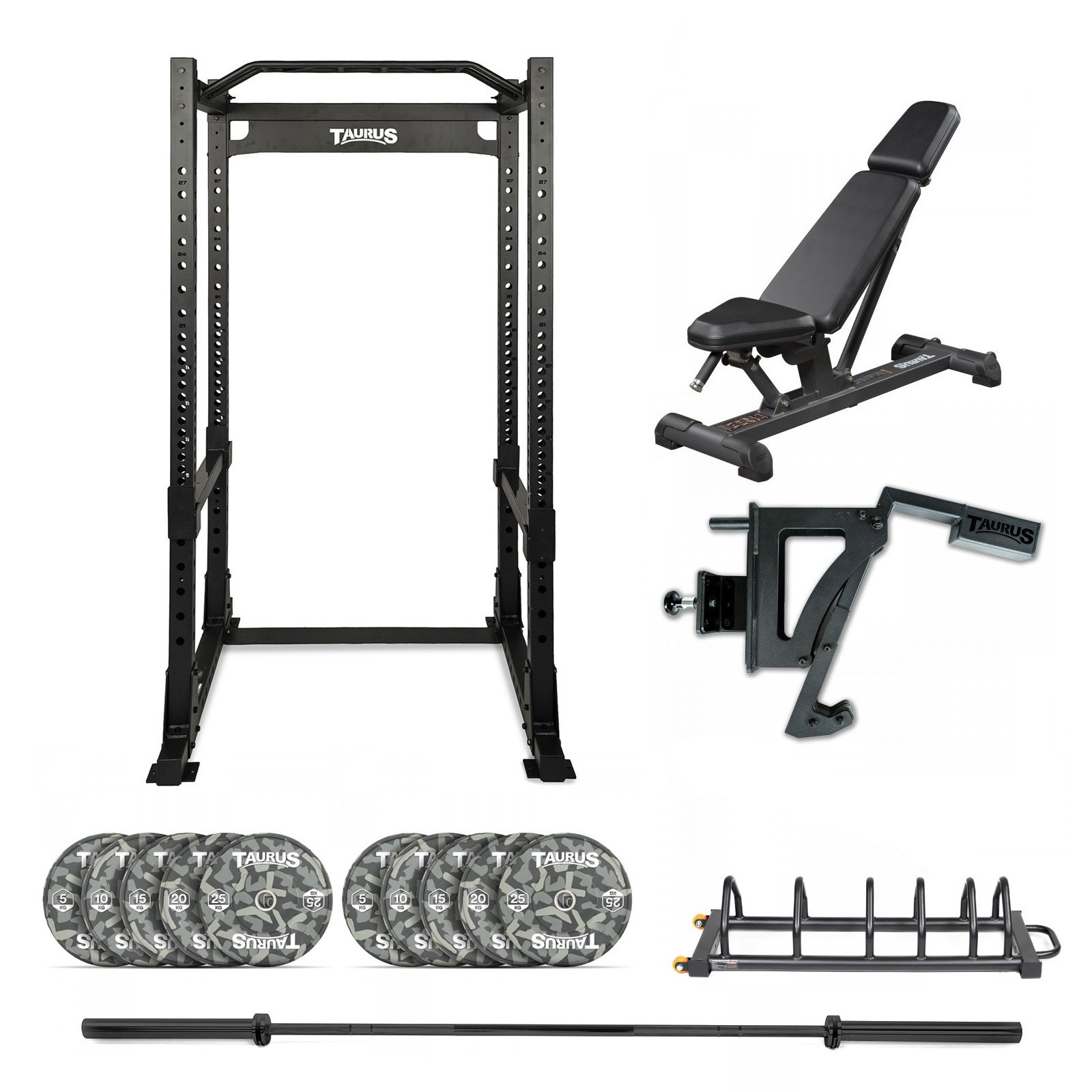 Taurus Elite Rack + Attachments + 150kg Camo Bumper Weight Kit + Toast Rack + Bench