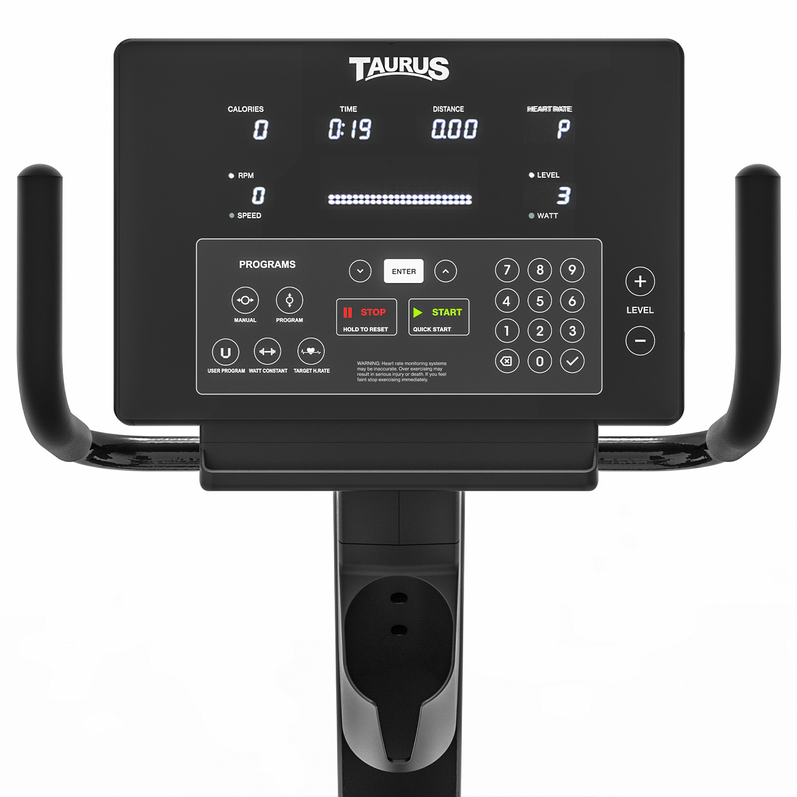 Display readouts: Time, speed, distance, calories, heart rate, RPM, resistance, watts