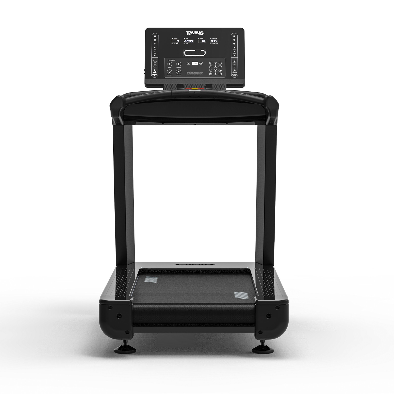 The layout is clean and practical. The flat console surface is easy to wipe down between sessions, the frame feels confidently sturdy under daily use, and the central control paddles keep adjustments within easy reach when several treadmills are set up in a row.