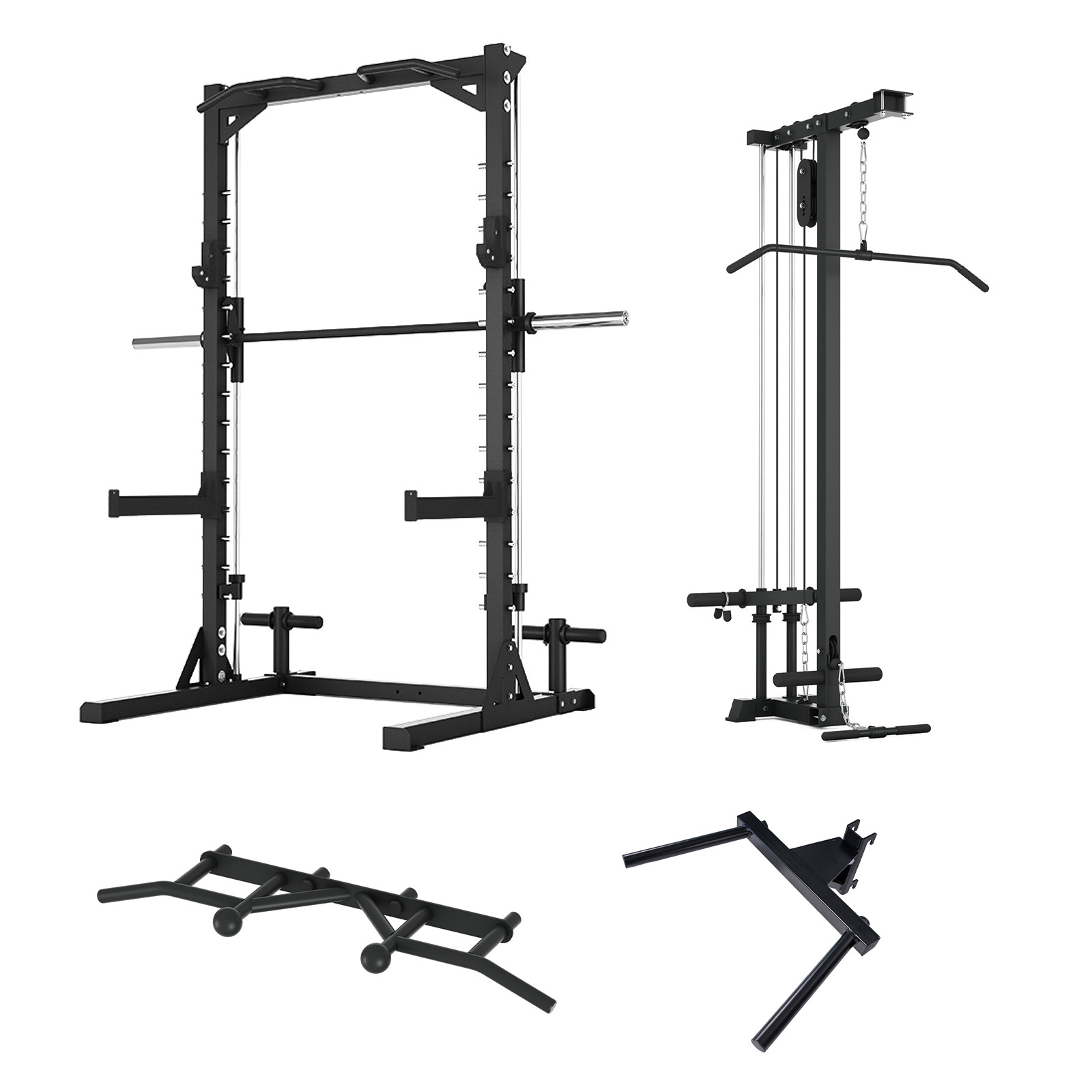 - Includes 16.5 kg Smith bar, half rack, and pull-up station