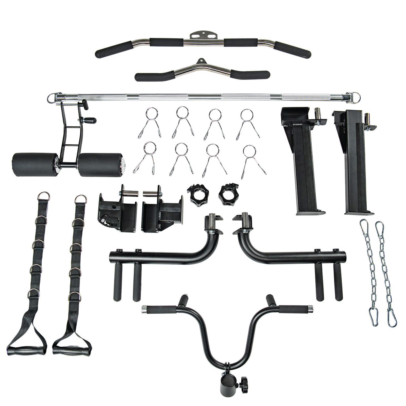 - Included attachment: Rotational core trainer, barbell row attachment, ab-crunch attachment, lat pulldown bar, straight double-ended bar, multi-grip dip station