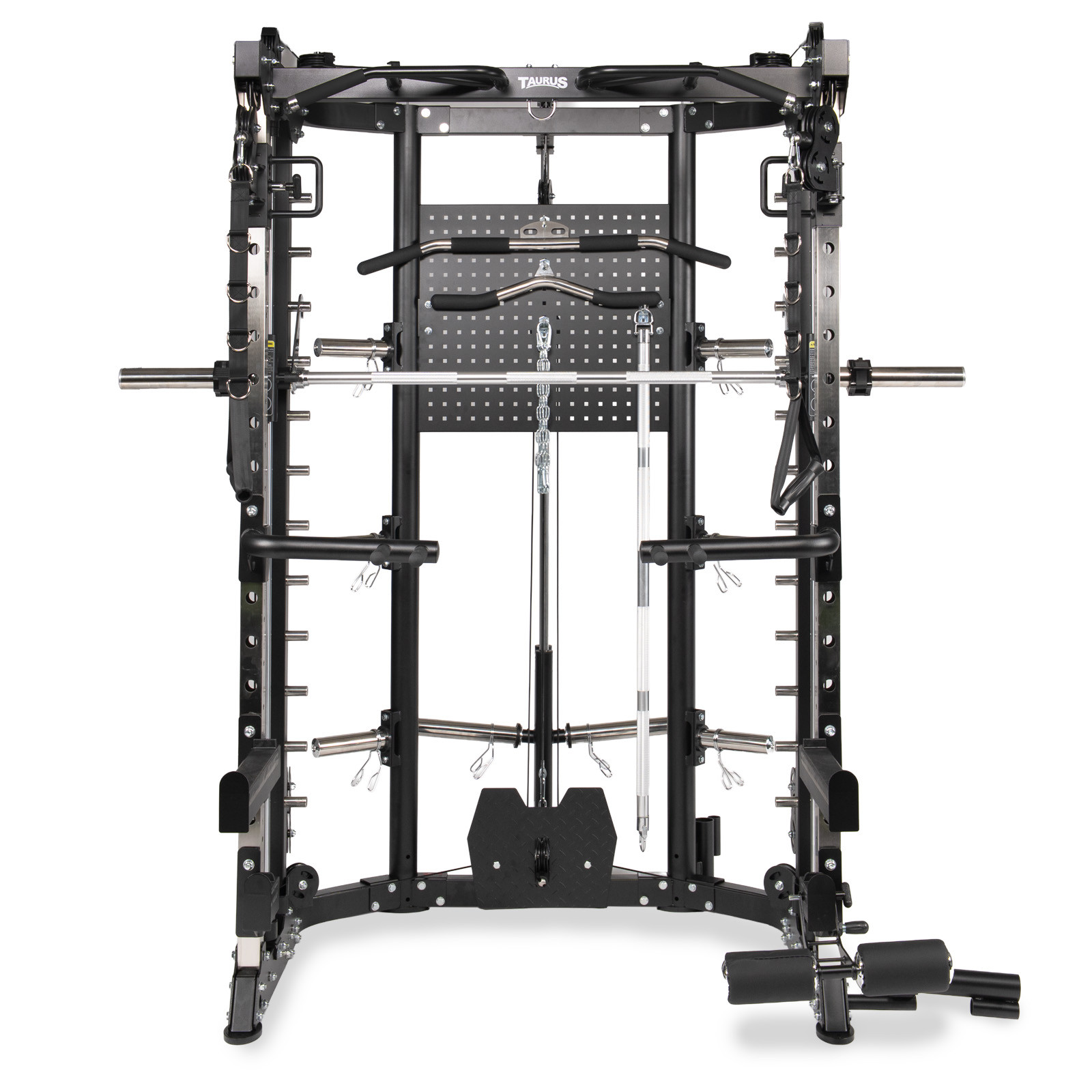 The Taurus MS30 combines a Smith machine, dual-pulley functional trainer and a power rack into a single unit. The MS30 uses Olympic weight plates to provide up to 200 kg of 1:1 resistance on the dual-pulley system. The counterbalanced Smith machine is rated to 400 kg, providing a massive range of resistance for users of all fitness levels. Combined with a host of attachments and extras, the Taurus MS30 is equipped to face every challenge you throw at it.