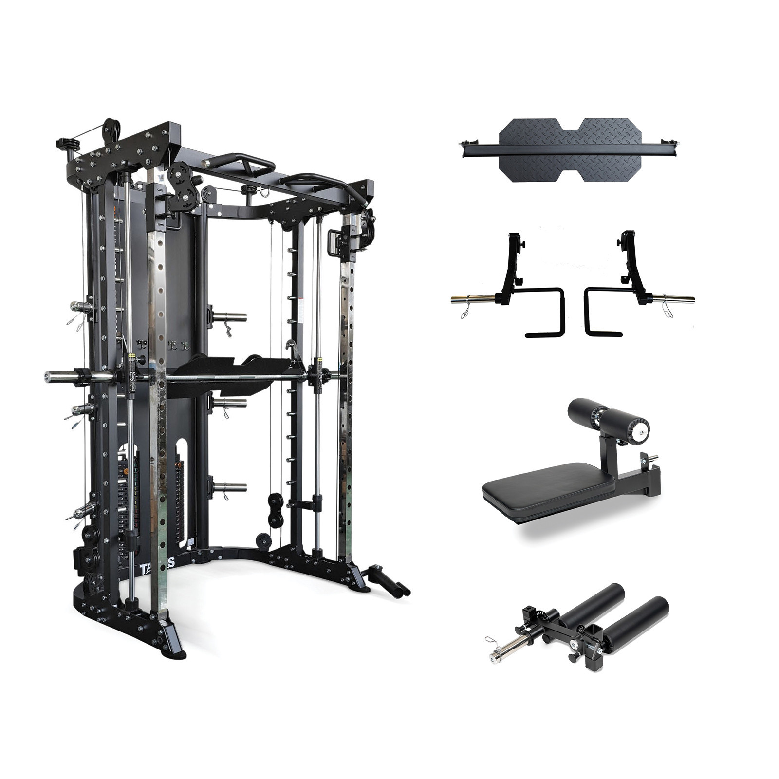 The Taurus MS35 is much more than a Smith machine, it's a full body functional trainer that is equipped with multi-grip pull up bars, landmine holder, dip bars, spotter bars and J-hooks for barbells and much more. The MS35 brings a fully equipped gym to your home or studio and take your workouts to the next level.
