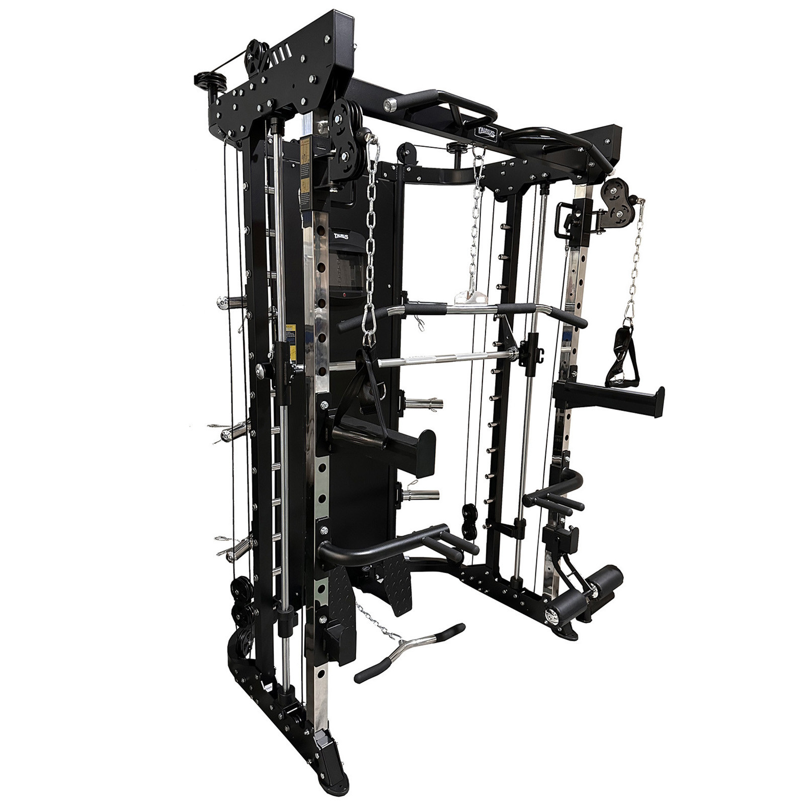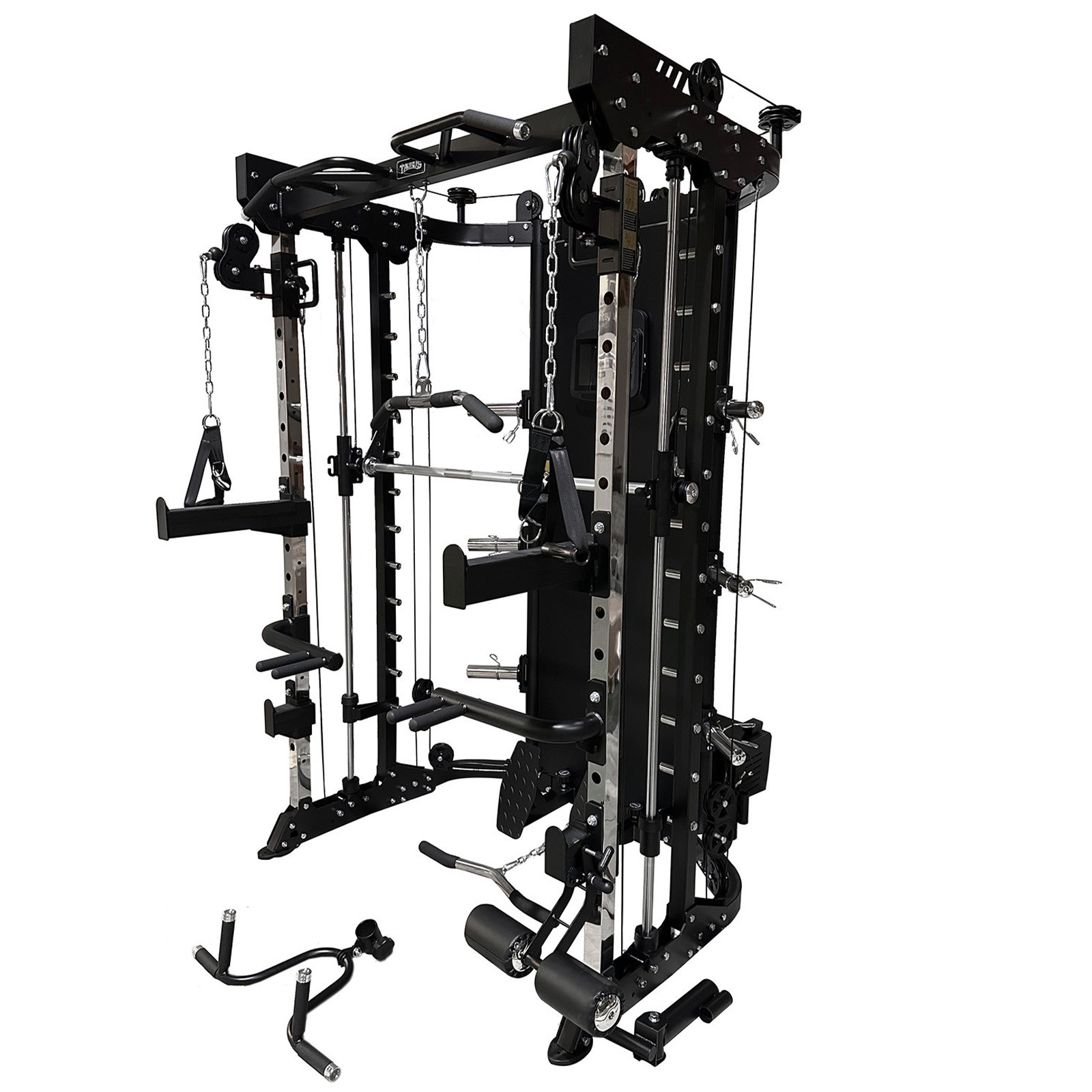 - All in one station with Smith setup, adjustable pulleys, pull up bar, dip handles and landmine attachment