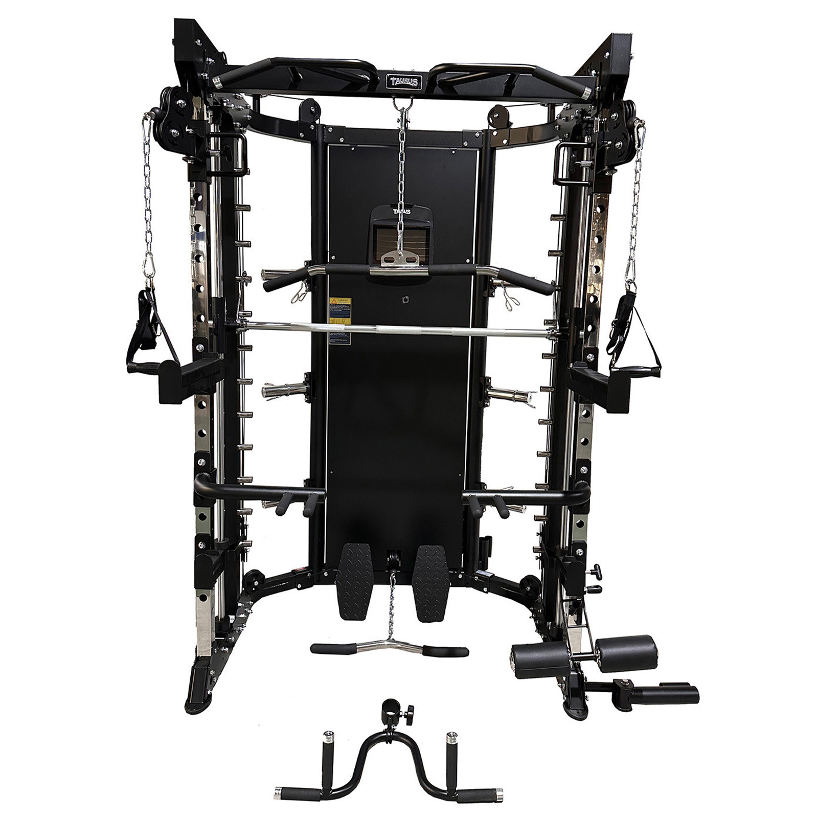 Included attachments: Pull-up bar, Smith barbell, cable pulleys, dip handles, lat bar, cable handles, leg developer, landmine, barbell holders, weight storage, footplate, carabiners, spotter arms