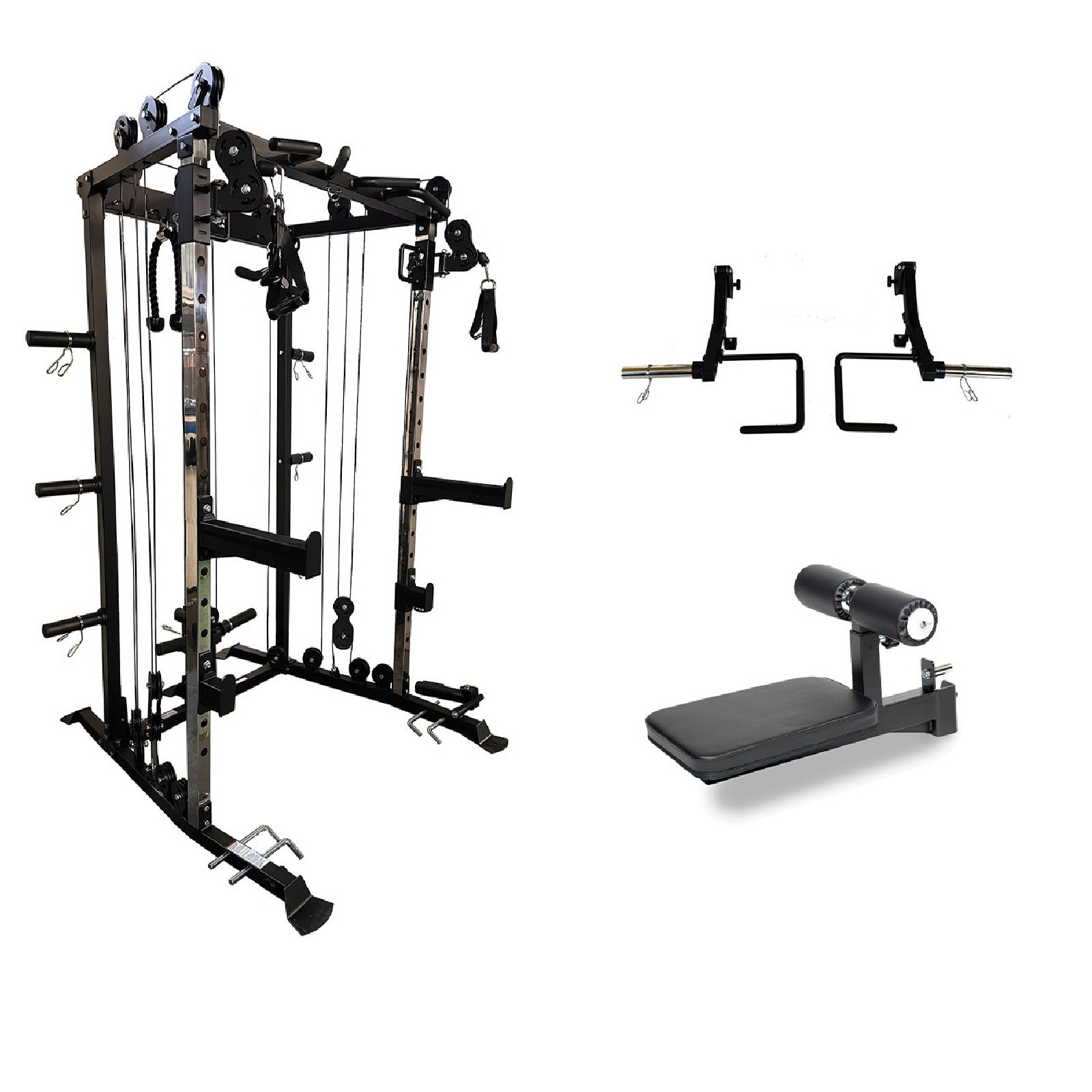 With its 2:1 transmission ratio, the Taurus MS5 Plate Complete Trainer ensures smooth and controlled cable movements for natural and precise exercises. It supports upper body strength exercises, such as pull-downs and tricep extensions, as well as lower body exercises like lunges and squats. It comes with a range of attachments, including a tricep rope, stirrup handles, and a lat pulldown bar.