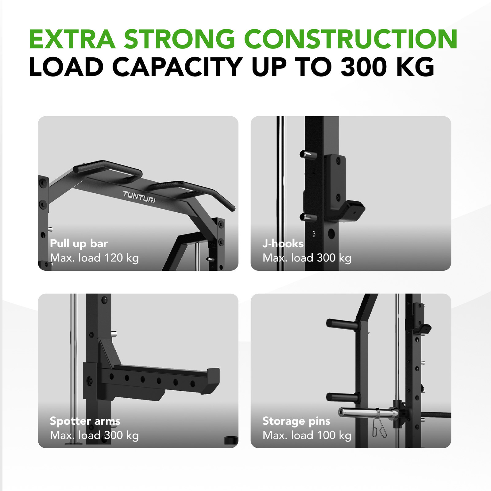 As a multifunctional station, the Tunturi SM70 offers an array of options to make the most of your strength training. Smith machines provide a safe way to train compound lifts such as squats and bench press, and with a maximum load of 300 kg, the SM70 comfortably matches most training goals.