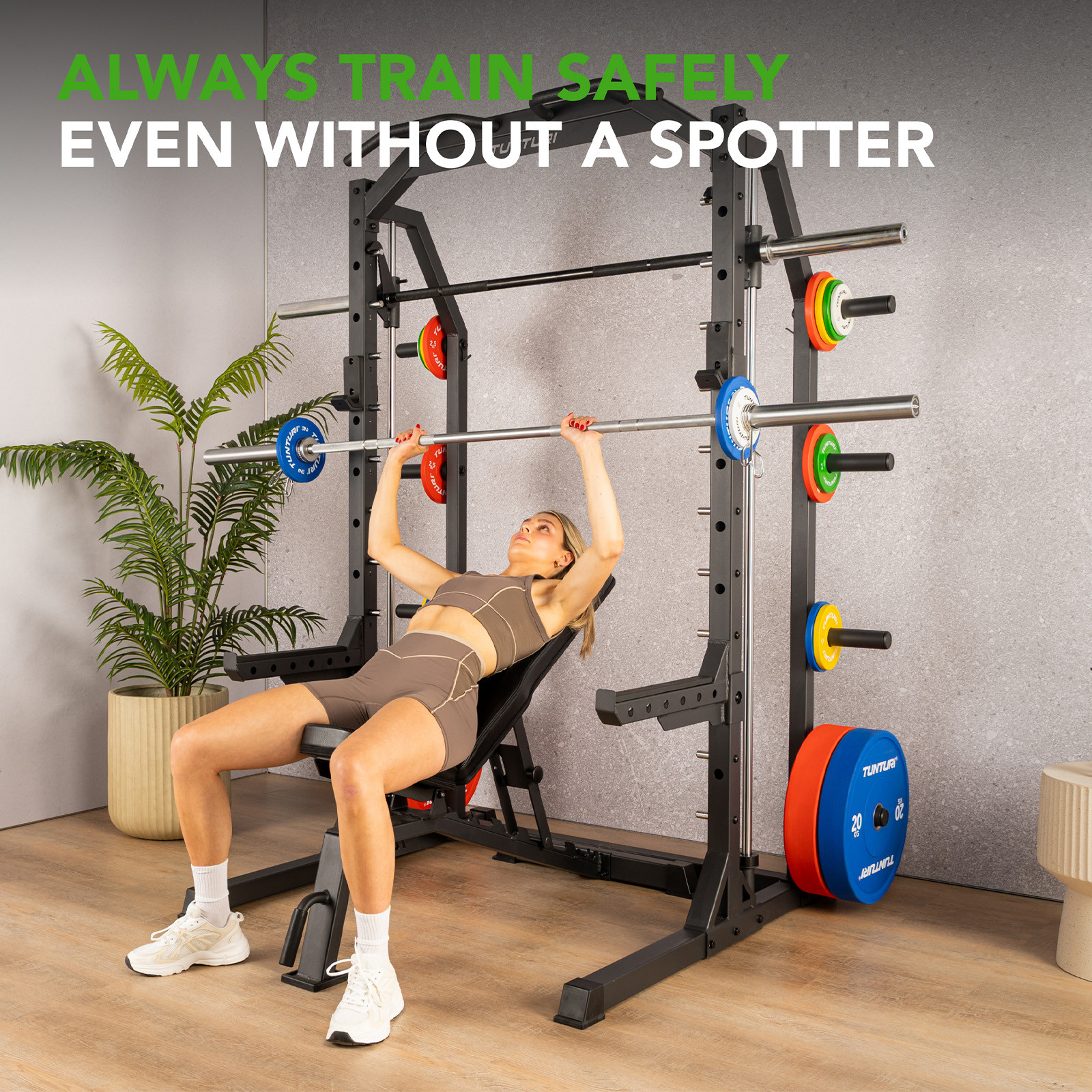 The Tunturi SM70 can be adjusted to 10 different heights to perform a wide range of exercises safely, without the need for a spotter. The SM70 also features eight storage pins for Olympic (50 mm) weight plates to keep your gym space organised.