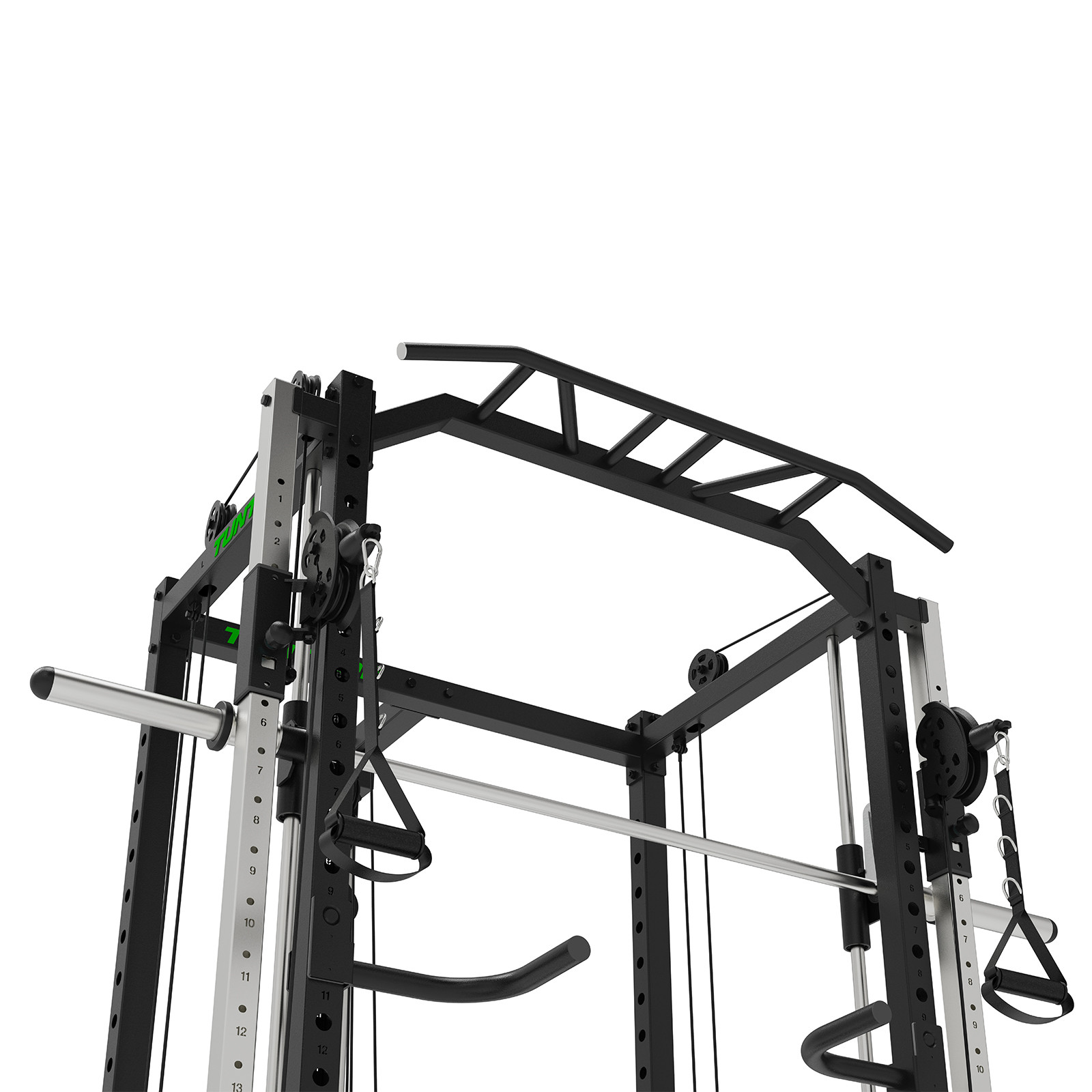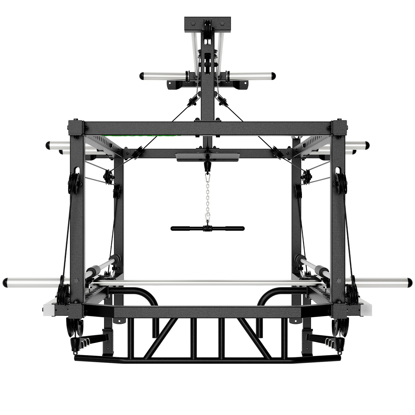 - Stations include a Smith machine, multi-grip chin-up bar, low pulley, dipping bars, dual pulley, and squat rack.